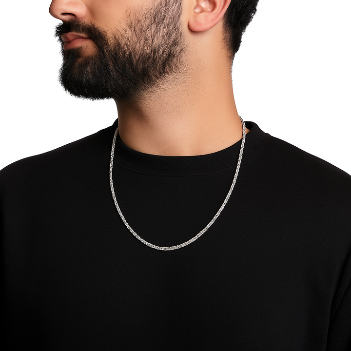 Massive Königskette (vierkant) mit 2,2mm Kantenbreite. Die Königskette besteht aus massivem 925er Silber und ist entsprechend gestempelt. Ein passender Karabinerverschluss und dezente Endkappen ergänzen die hochwertigen Kettenglieder und lassen keinen Zweifel an der Langlebigkeit der Königskette.