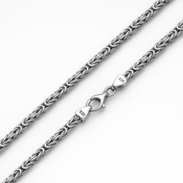 Massive Königskette (vierkant) mit 3mm Kantenbreite. Die Königskette besteht aus massivem 925er Silber und ist entsprechend gestempelt. Ein passender Karabinerverschluss und dezente Endkappen ergänzen die hochwertigen Kettenglieder und lassen keinen Zweifel an der Langlebigkeit der Königskette.